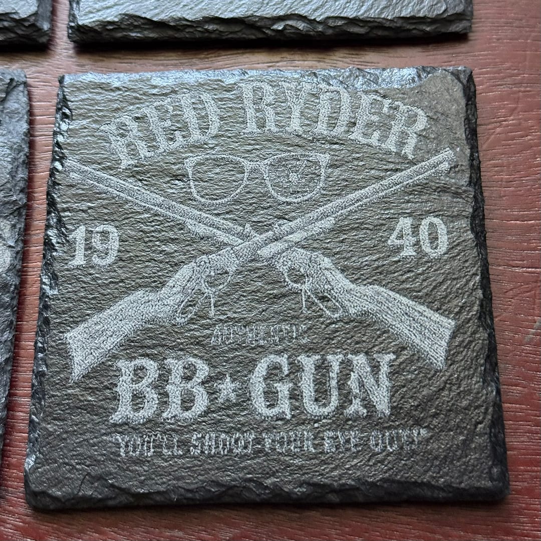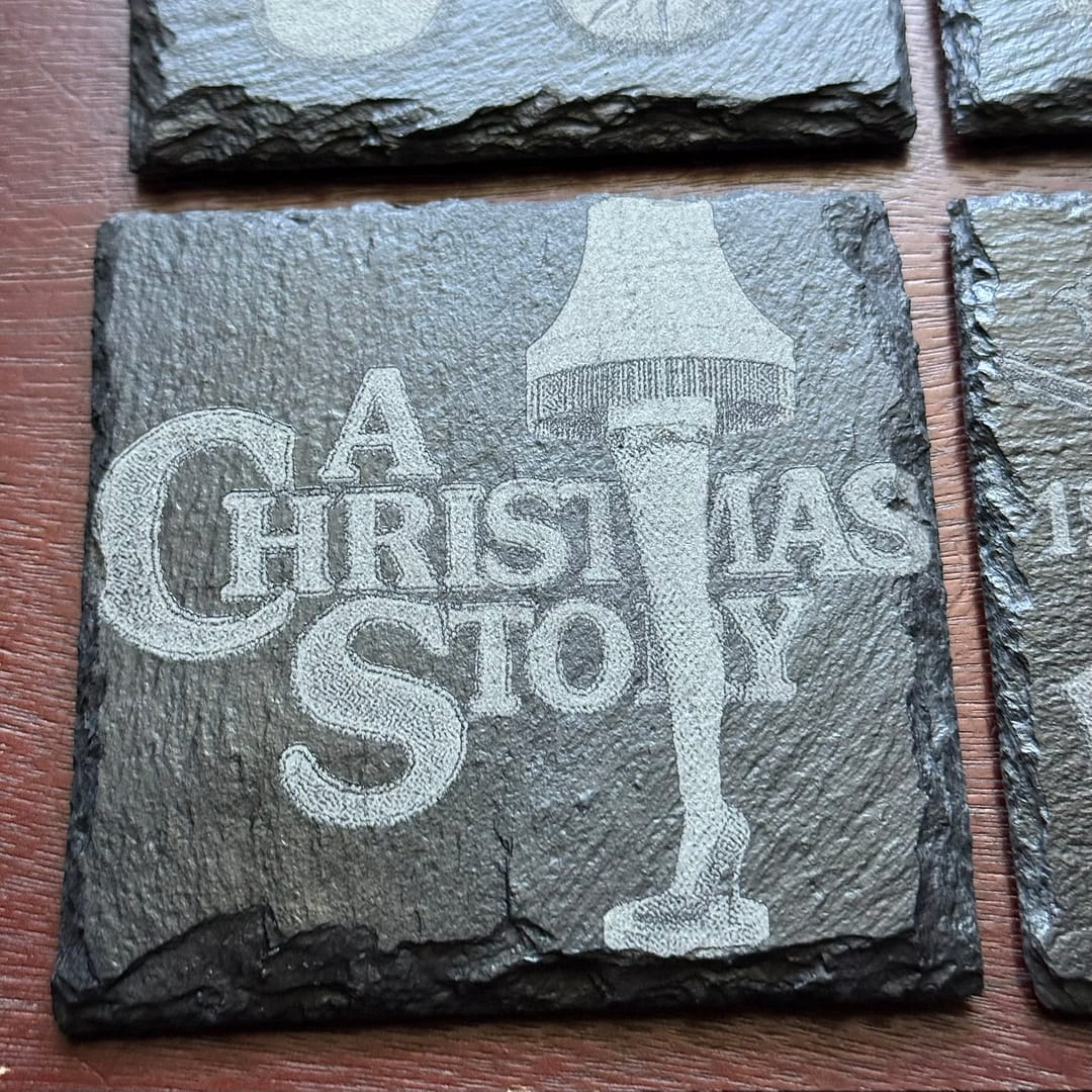 Bring the nostalgia of A Christmas Story to your holiday décor with this premium set of 4 laser-engraved slate coasters — each one featuring an iconic scene or quote from the beloved Christmas classic!