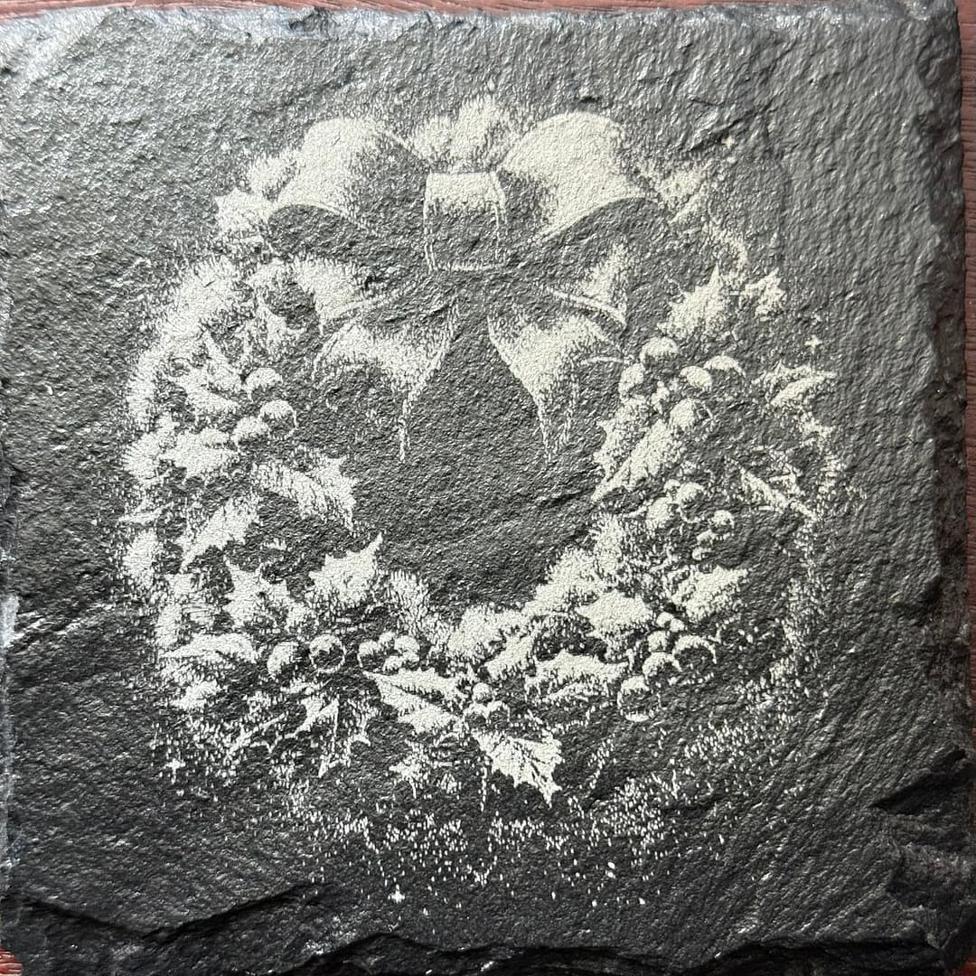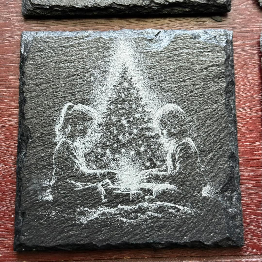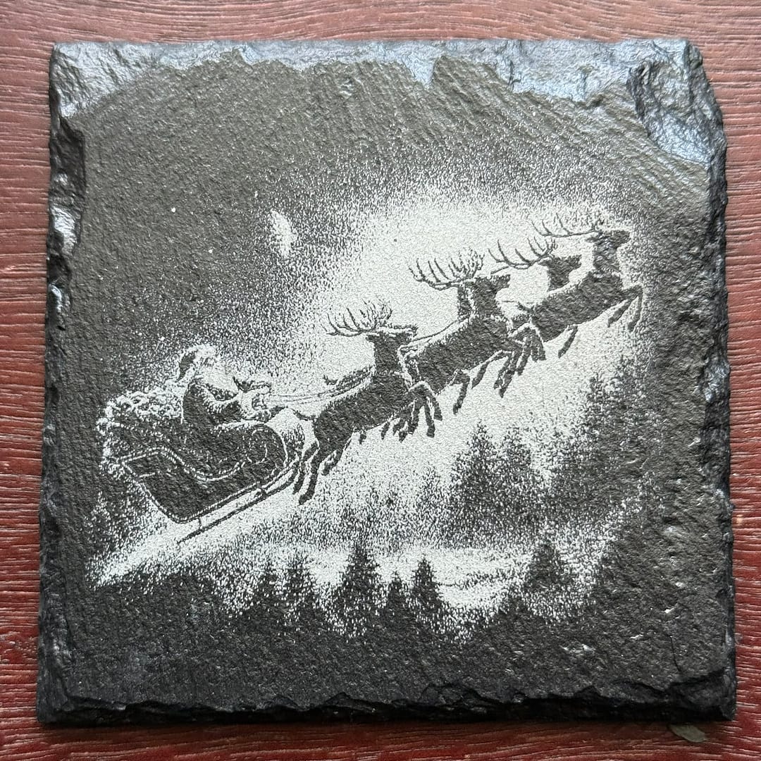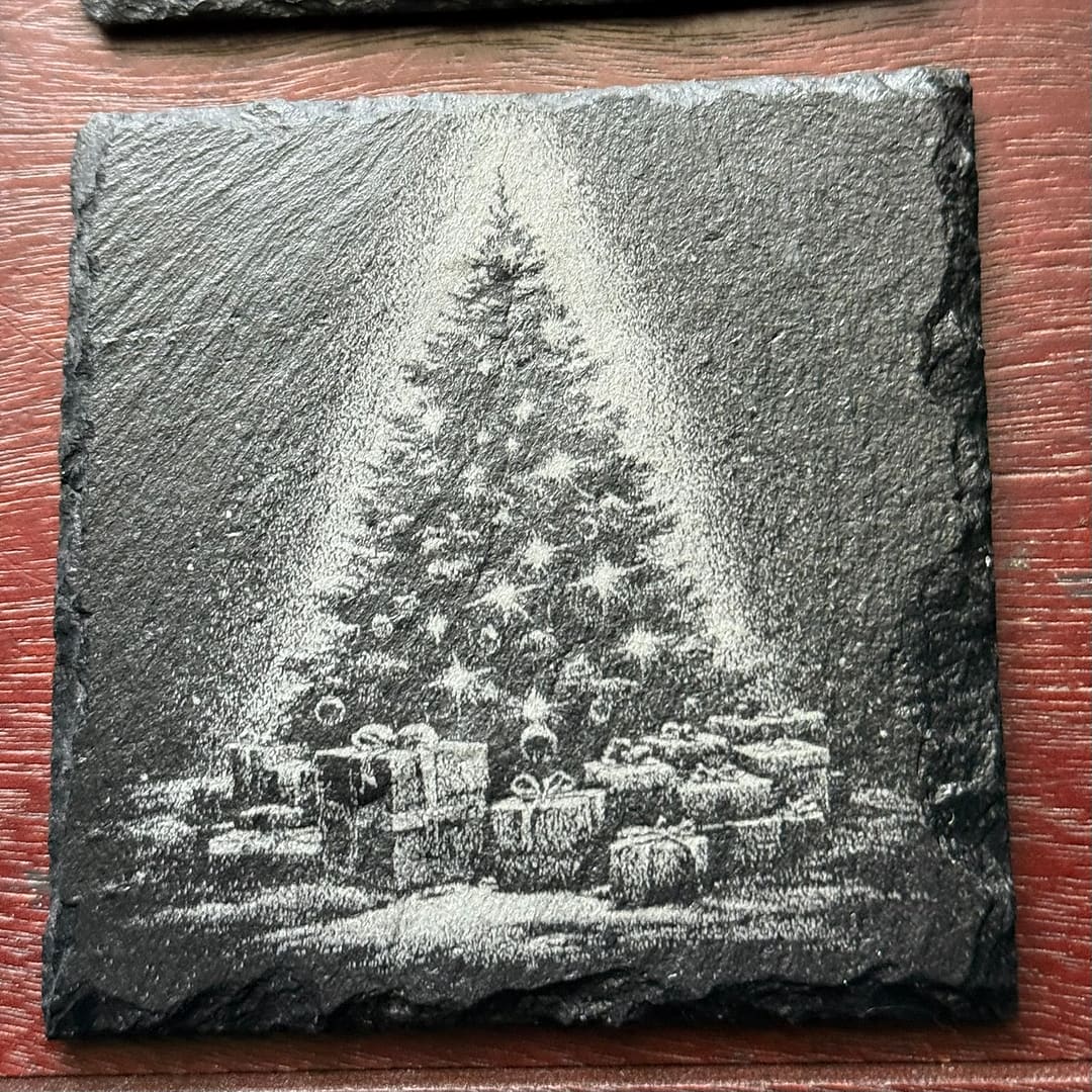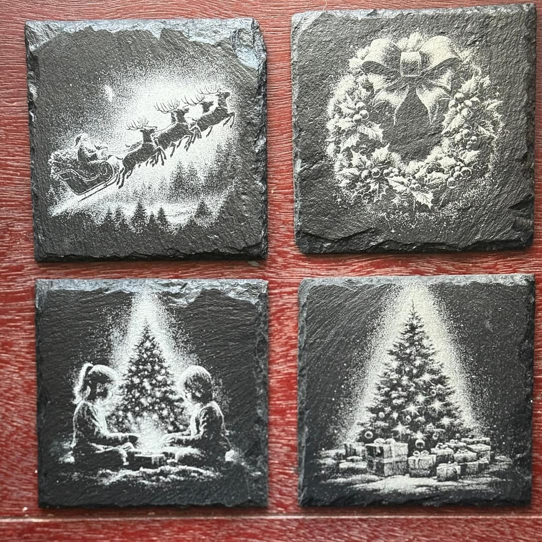 Celebrate the warmth and nostalgia of the holiday season with this set of 4 engraved slate coasters, featuring timeless Christmas scenes that capture the spirit of tradition and joy. Each piece showcases exquisite laser-etched detail: