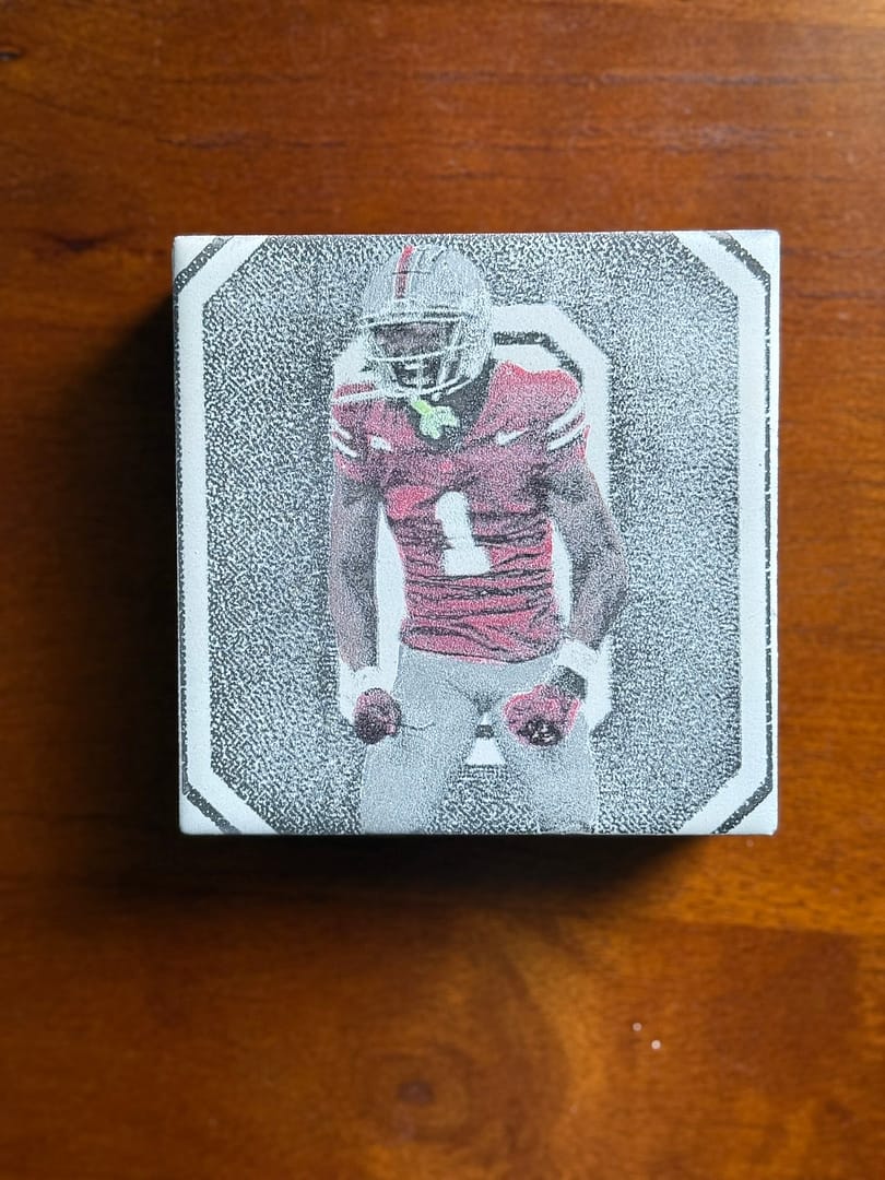 With this set of custom Ohio State Buckeyes coasters. Each coaster is crafted from durable ceramic, sized at 4×4 inches, and features laser engraved and hand painted player designs that make every piece unique. The detailed artwork highlights the Buckeyes spirit while adding a bold touch to your home décor.