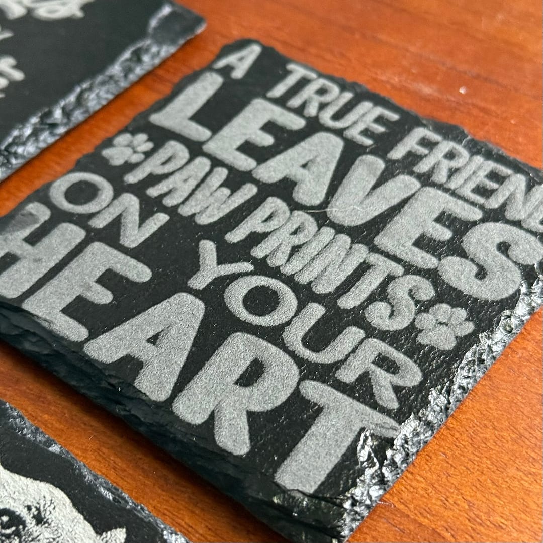 These natural slate stone coasters measure approx. 4×4 inches, with a rustic edge and durable, water-resistant finish. Each piece of slate is unique, adding to the charm of your personalized set. Whether used as a thoughtful pet memorial gift, a birthday present for a dog lover, or a fun addition to your own home, these coasters make every sip more meaningful.