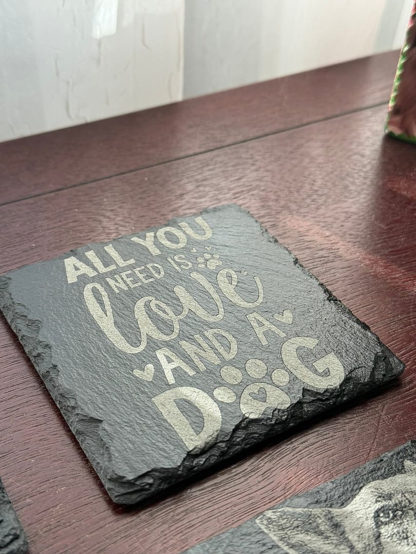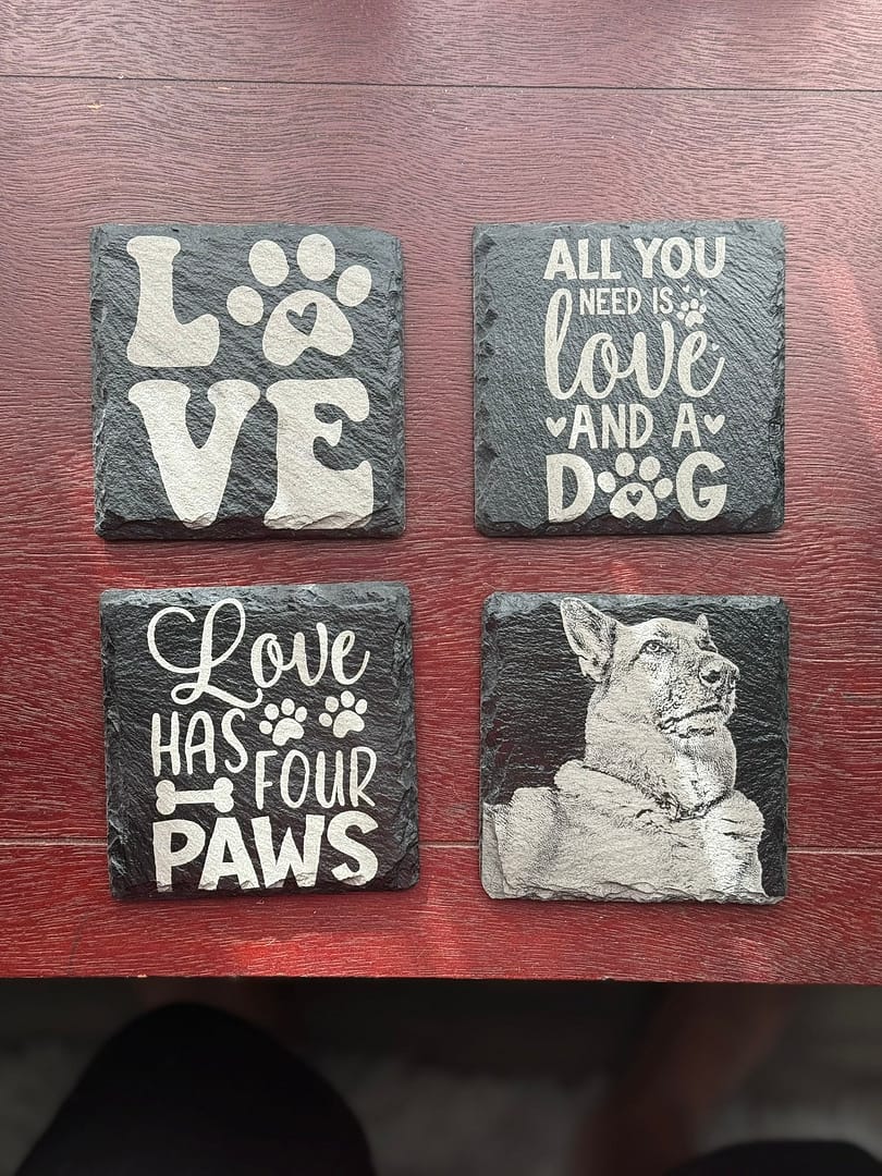 Celebrate the love of dogs with this set of 4 engraved slate coasters, perfect for dog moms, dog dads, and pet lovers everywhere. Each set features three beautifully engraved designs with heartwarming dog quotes, and the fourth coaster is customized with a photo of your own pet! Select which design you want from the drop down boxes labeled Coaster 1, Coaster 2, Coaster 3, and then upload your favorite photo of your pet!